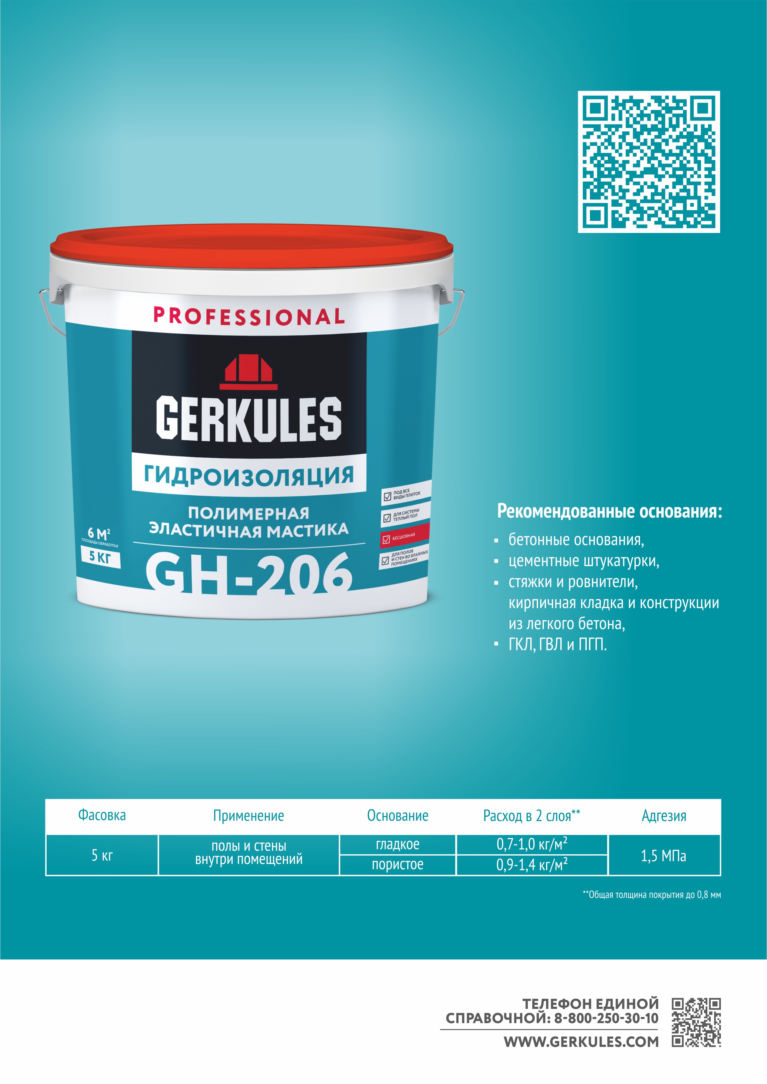 Дальнейшая отделка производится только на высохшую поверхность гидроизоляции, но не ранее чем через 12 часов (при +20°С и влажности воздуха 50%) после нанесения последнего слоя. Приклеивание плиток осуществлять клеями класса не ниже С2! Рекомендованные продукты: GERKULES GM-245 PRO, GM-255 PRO.