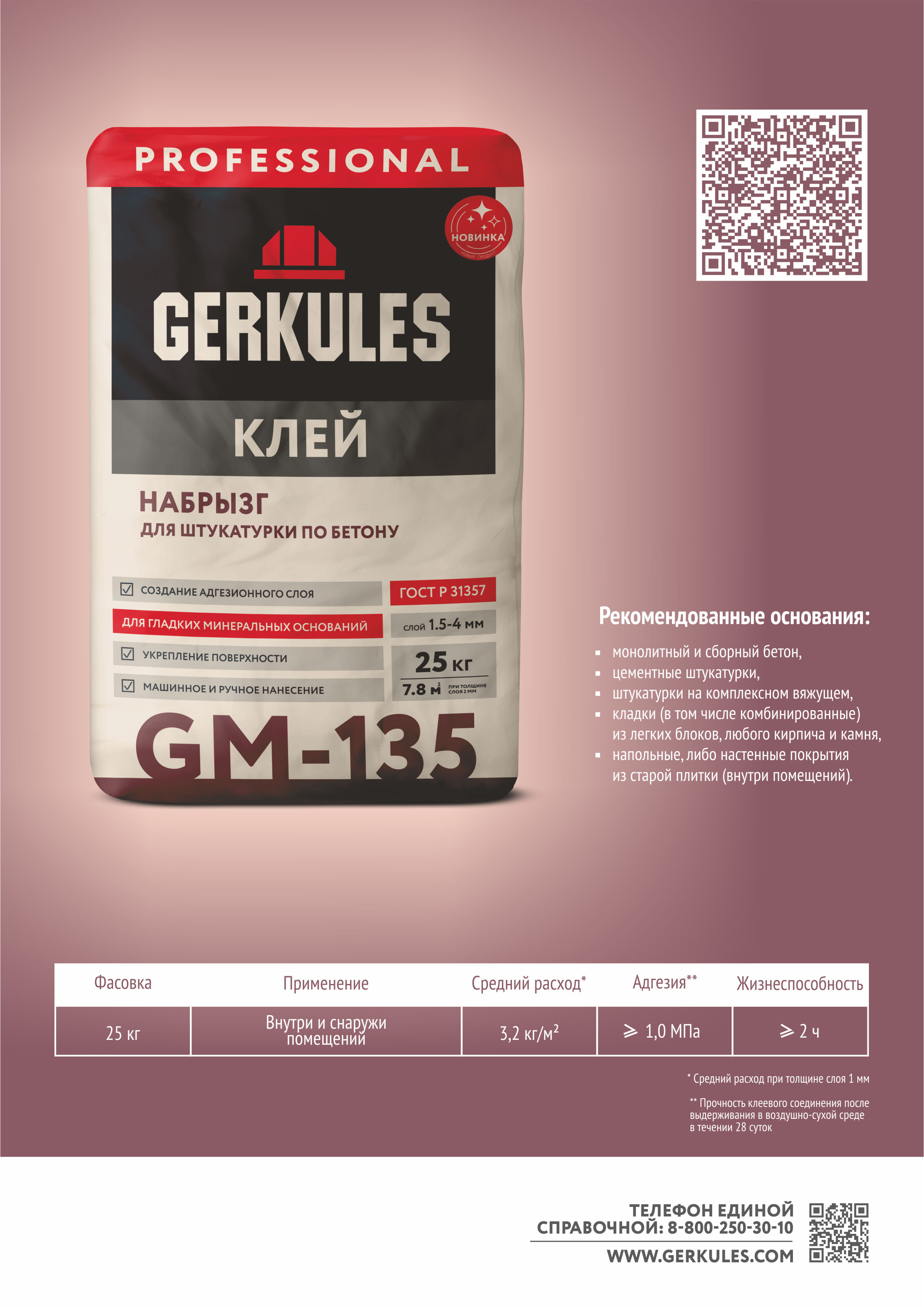 Полученная поверхность подходит для дальнейшего нанесения штукатурок GERKULES GP-21M, GP-111, GP-51, GP-31 и GP-21.