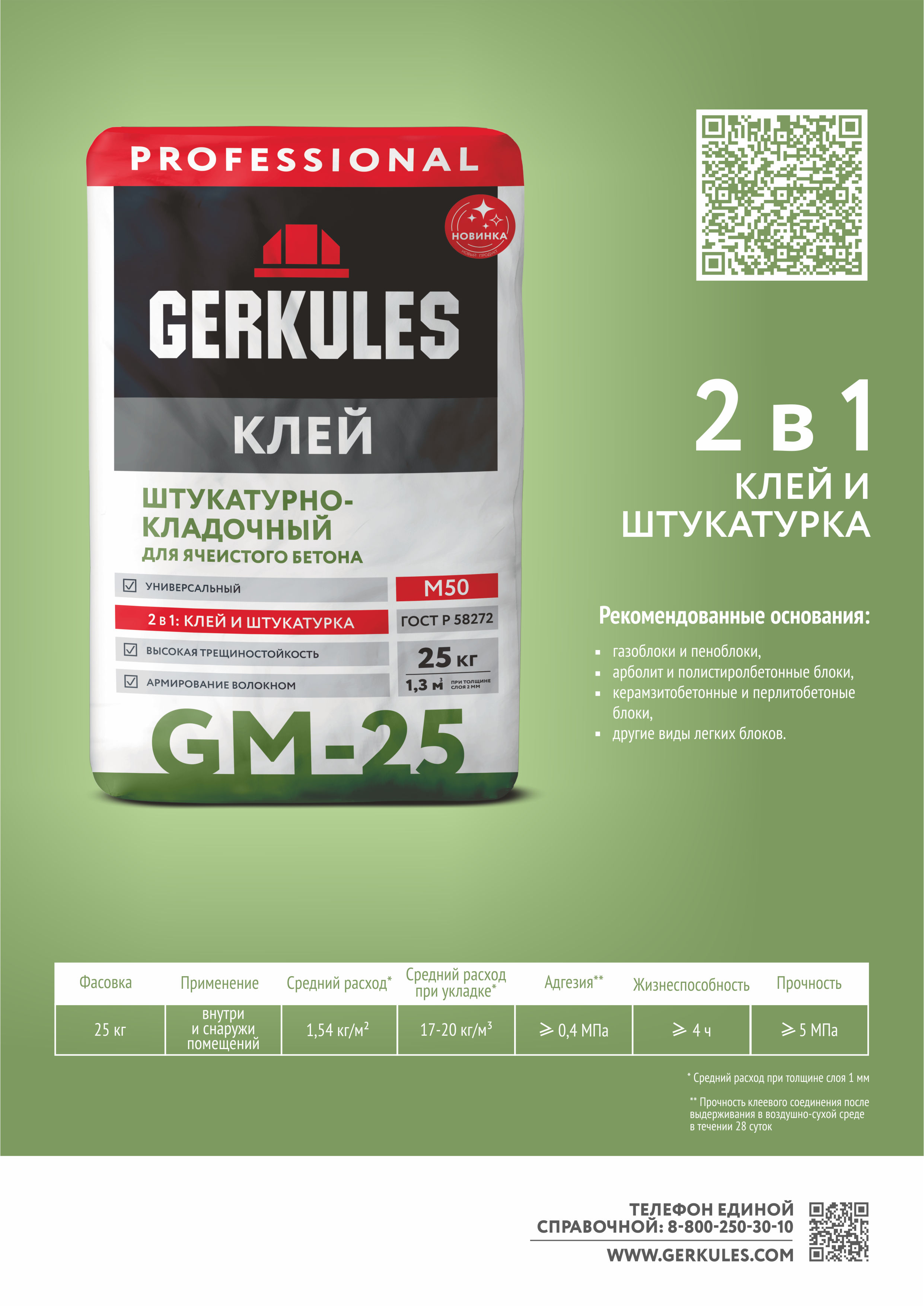 Через 24 часа после укладки блоков, поверхность можно штукатурить при помощи раствора GM-25. Перед началом работ поверхность необходимо механически очистить от отслаивающихся частиц с помощью щетки или другого инструмента, а также, обеспылить и обработать с помощью грунтовок GERKULES GE-29 или GE-129 согласно инструкции.