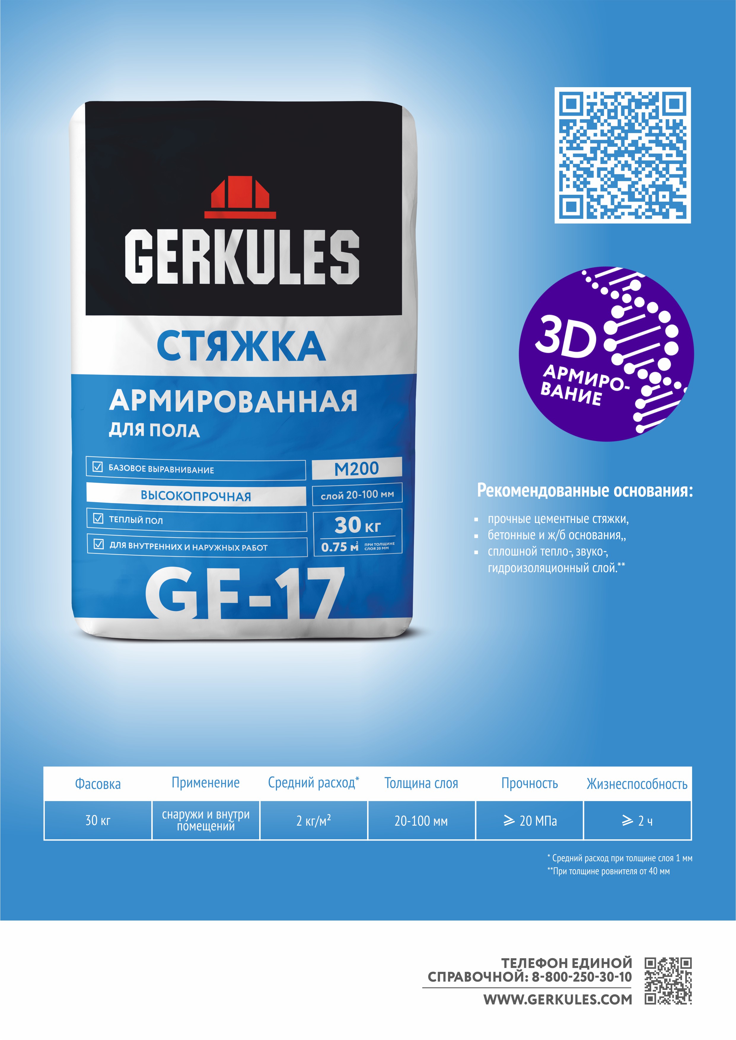Стяжка армированная цементная высокопрочная предназначена для создания, выравнивания и ремонта полов внутри и снаружи помещений, в том числе в местах повышенной влажности. Используется в качестве базового слоя под наливные полы и облицовку керамической плиткой. Допустимо применение под дальнейшее укрытие паркетом, ламинатом, линолеумом, ковролином, и другими финишными покрытиями. Подходит для систем «Теплый пол» и «Плавающий пол» внутри помещений. Наносится в один слой толщиной 20 - 100 мм.